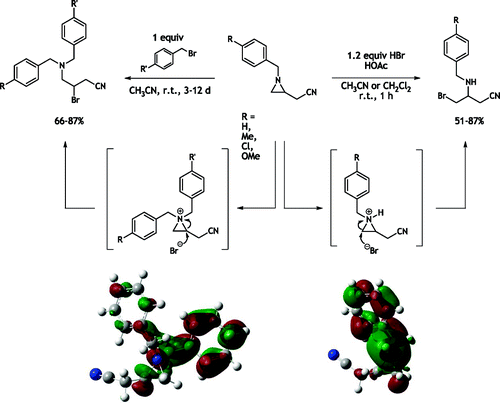 Opposite Regiospecific Ring Opening of 2-(Cyanomethyl)aziridines by Hydrogen Bromide and Benzyl Bromide: Experimental Study and Theoretical Rationalization